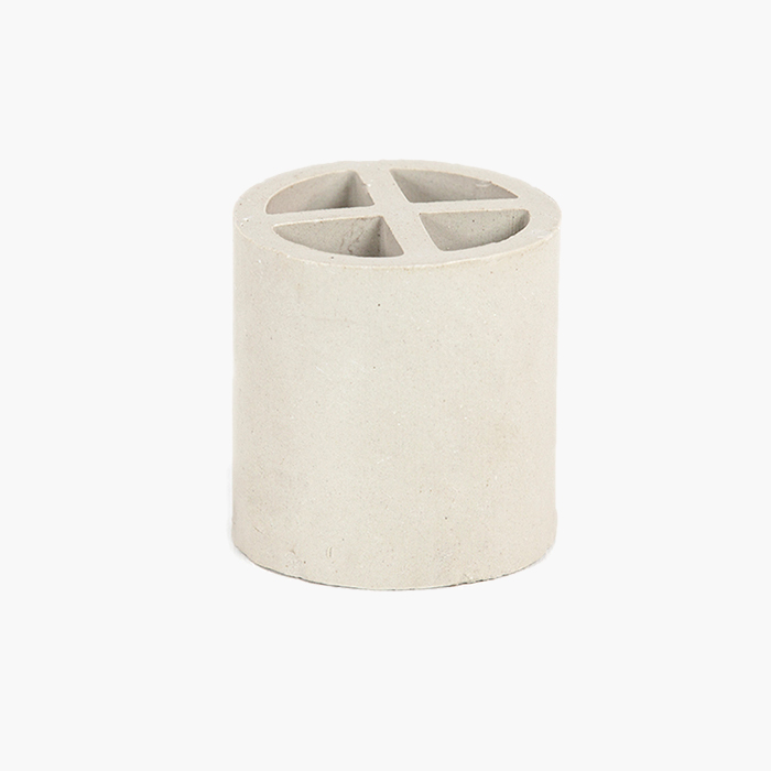 陶瓷十字隔板環(huán)填料是基于增加填料的比表面積,從而強化傳質(zhì)效率而開發(fā)出來的。 其形狀是在拉西環(huán)中間增設(shè)了十字隔板。 一般來講,這種填料由于尺寸較大,僅適用于整體堆徹,目前一般只作為亂堆填料的塔底支撐分布層用。