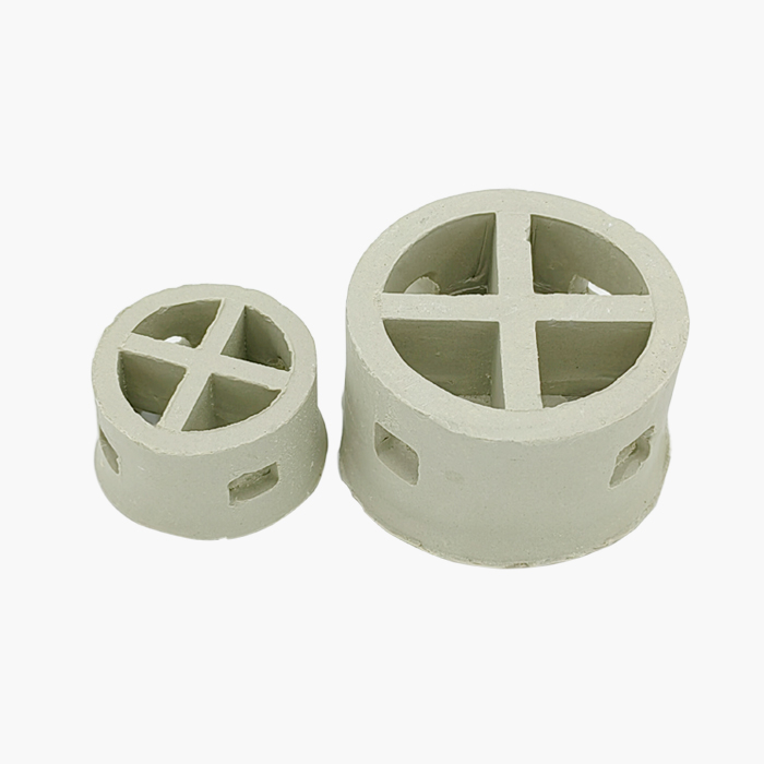 陶瓷階梯環(huán)吸收了短拉西環(huán)的特點(diǎn),也改變了填料的環(huán)高與直徑相等的習(xí)慣,降低了環(huán)的高度,減薄了材質(zhì)的厚度,并在環(huán)的側(cè)端增加了翻邊。