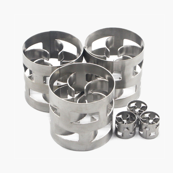 金屬鮑爾環(huán)填料是采用金屬薄板沖制而成,在環(huán)壁上開(kāi)出了兩排帶有內(nèi)伸舌葉的窗孔。每排窗孔有五個(gè)舌葉,每個(gè)舌葉彎向環(huán)內(nèi),指向環(huán)心,在中心處幾乎相搭,上下兩層窗孔的位置相互錯(cuò)開(kāi),一般開(kāi)孔的總面積約為整個(gè)環(huán)壁面積的35%左右,由于鮑爾環(huán)填料在環(huán)壁上開(kāi)了許多窗孔,使得塔內(nèi)的氣體和液體能夠從窗口自由通過(guò),目前鮑爾環(huán)填料是被采用的主要環(huán)形填料之一。