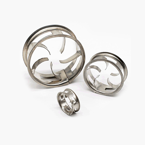 金屬階梯環(huán)填料是一種新型開孔型填料。它的高約為直徑的一半,一邊有錐形翻邊,環(huán)壁上開有窗孔,并有彎曲葉片伸向環(huán)心。由于此些特殊結構,改善了填料層內(nèi)氣液分布,增加了氣液接觸點,有利于液體匯聚分散及膜表面的不斷更新,使傳質(zhì)得到強化,分離效率大大提高。